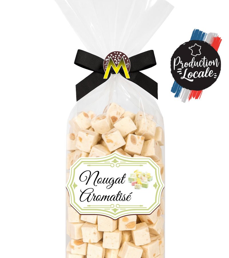 Ingrédients : miel, sucre, amandes, blancs d’œufs, sirop de glucose, arômes naturels selon la variété (vanille, café, citron, orange, praliné, etc.)