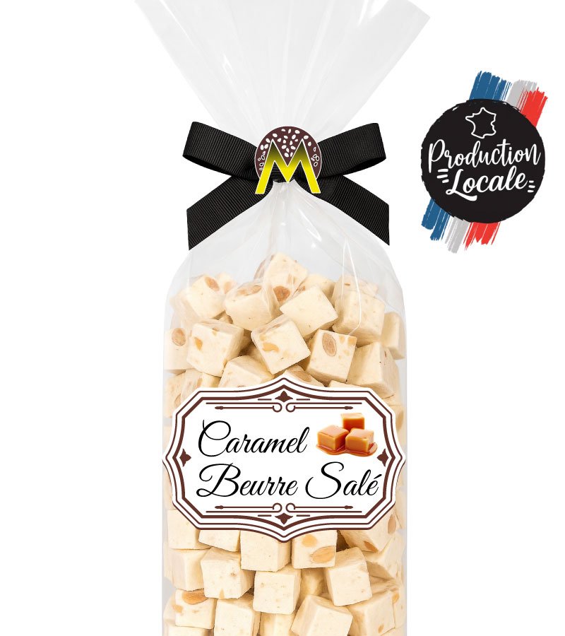 Notre recette repose sur des ingrédients nobles : miel de fleurs, amandes françaises légèrement torréfiées, blancs d’œufs montés à la main et un caramel maison délicatement salé au beurre demi-sel.